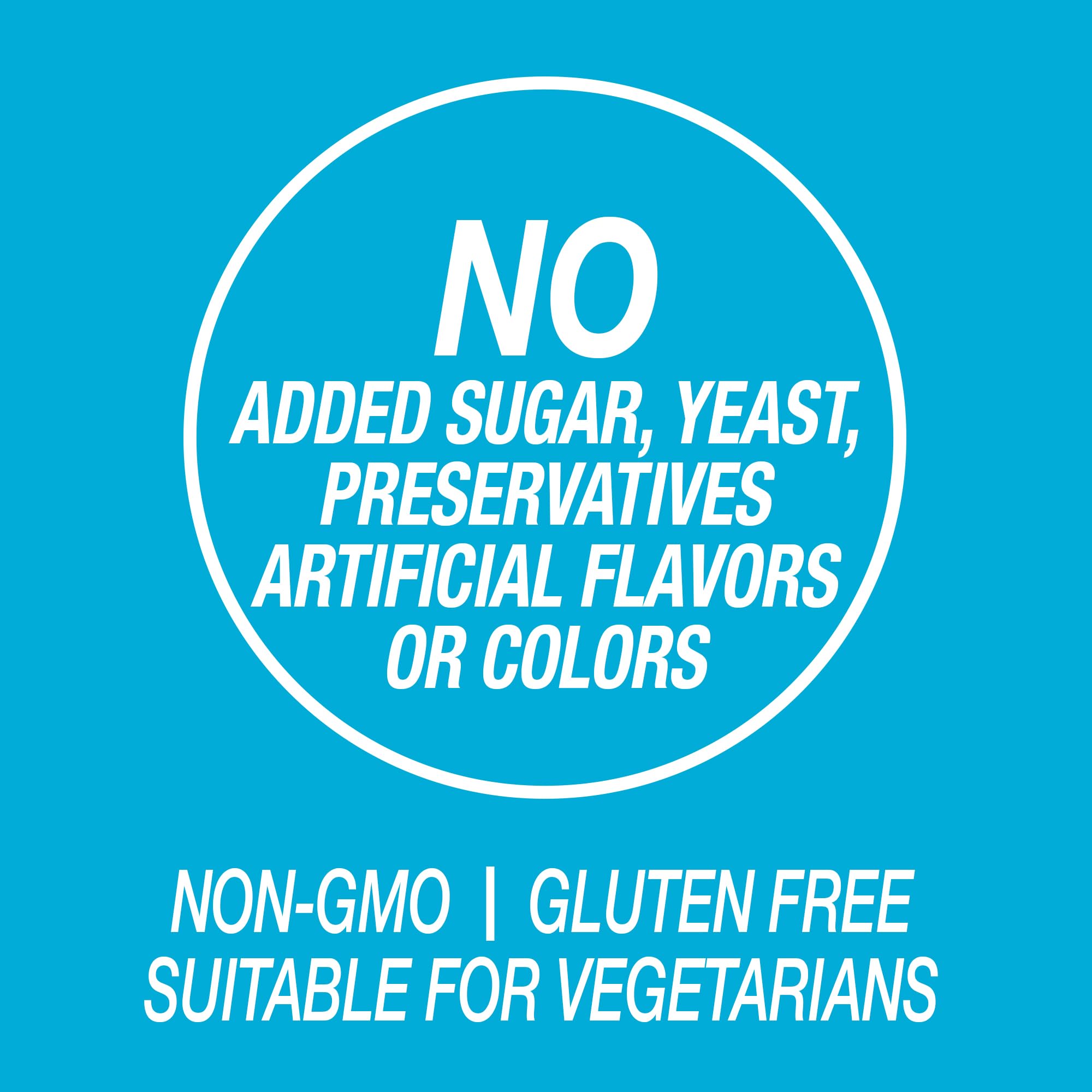 - NO ADDED: No added Sugar, Yeast, Preservatives, Artificial Flavors or Colors. Gluten Free. Suitable for Vegans. Non-GMO.